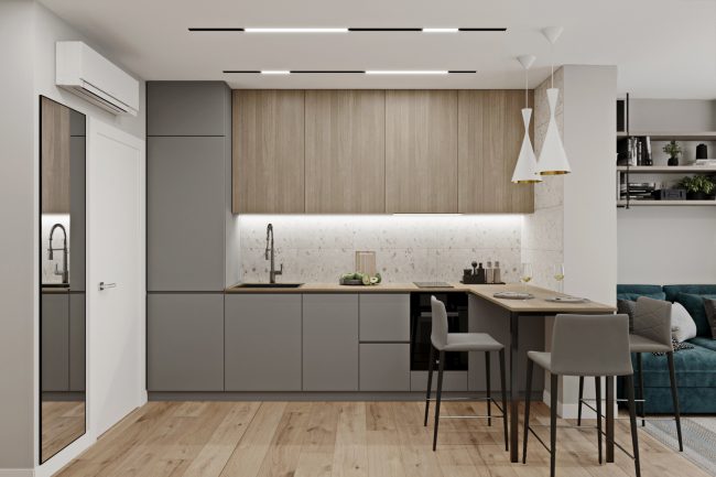 From the first step, the hallway defines the style of the space. Warm gray tones on the walls, combined with the wooden texture of the kitchen facades, create an atmosphere of warmth and sophistication. Vinyl flooring that mimics wood adds a natural quality to the space.