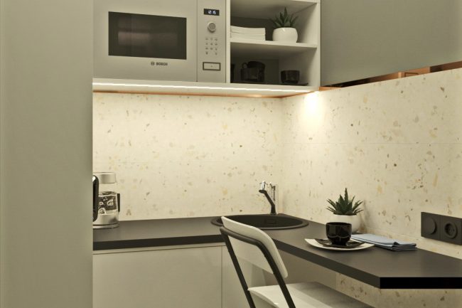 The floor is finished with terrace tiles in light gray, olive, and graphite colors. This color palette adds freshness and elegance to the space, creating smooth transitions between functional zones. The light gray color gives a sense of cleanliness and spaciousness, while olive and graphite accents highlight the modern and stylish look of the interior.