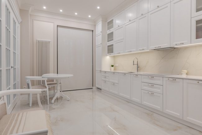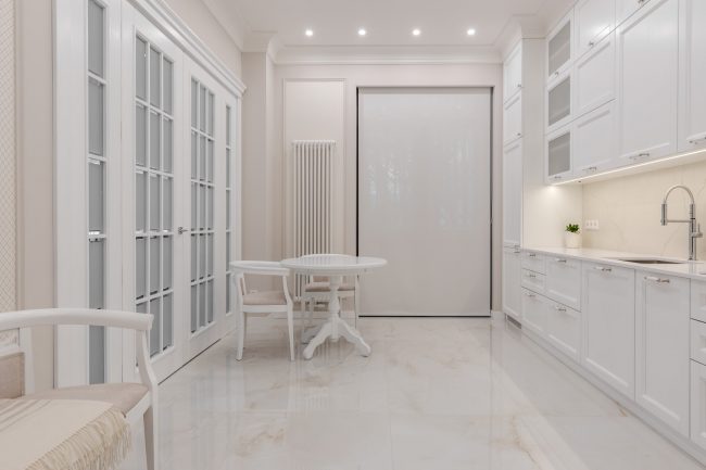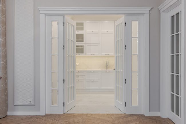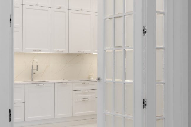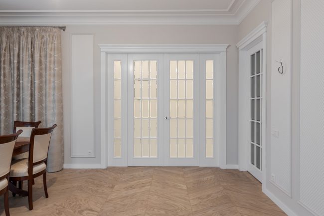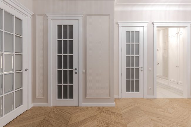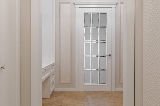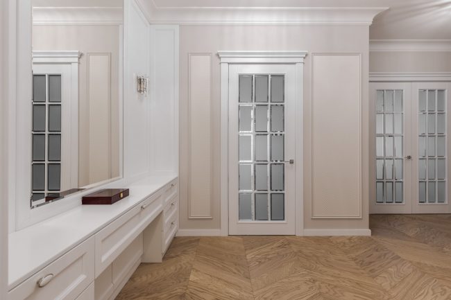 The harmony of soft pastel shades from milk white to creamy and pink, distinguished by moldings into rectangular wall panels of various tonal gradations, is emphasized by the snow-white surface of the gridded doors, made according to a single design. The diamond shine of the mirrored facets of matte glass inserts gives them an exclusively luxurious appearance.