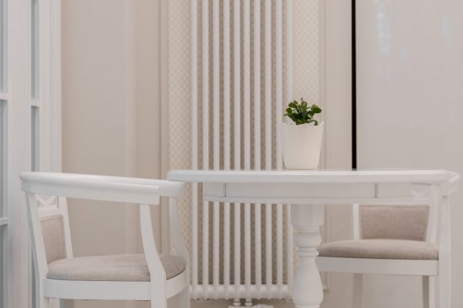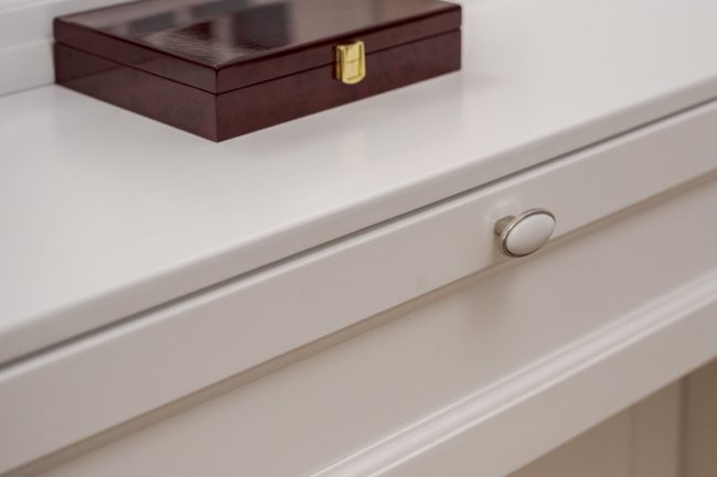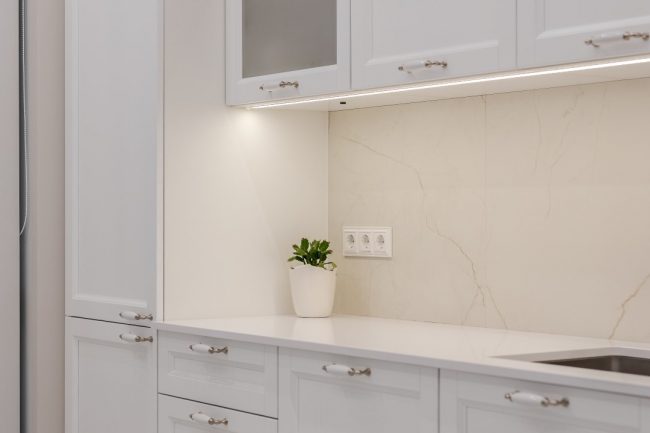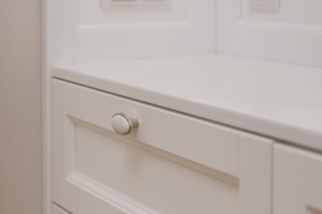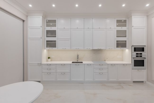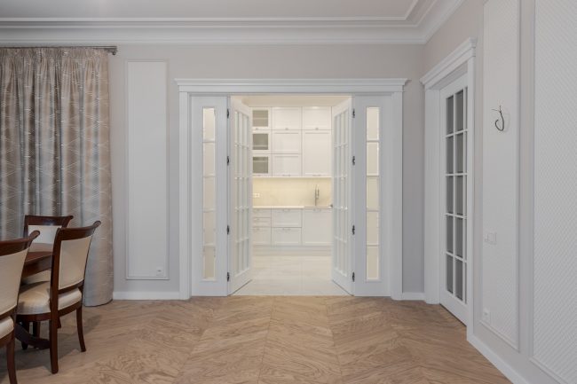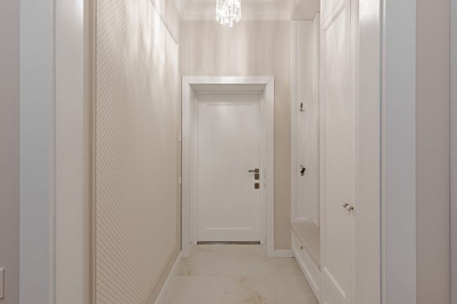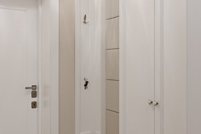 The snow-white reliefs of the facades of the kitchen set, the chest of drawers in the hall, the wall cabinet in the hallway, and the vanity under the sink in the bathroom are made according to a single sample. Their shape resonates with decorative cornices above the doors, referencing classical ancient Greek porticos. The apartment design is complemented by interiors featuring wide cornices with exquisite outlines at the junctions of the ceiling and walls, and expensive lamps with crystal pendants.