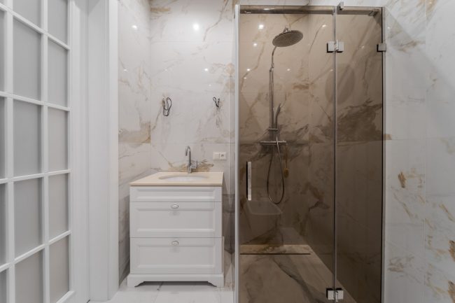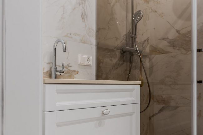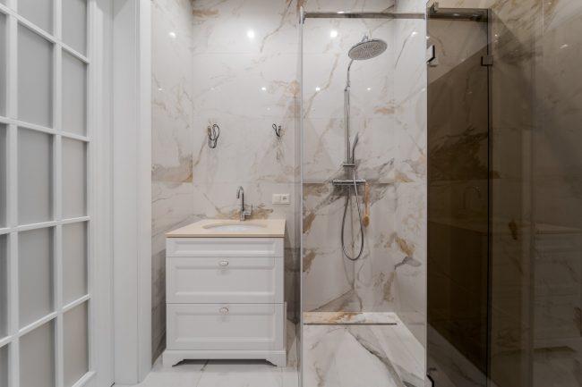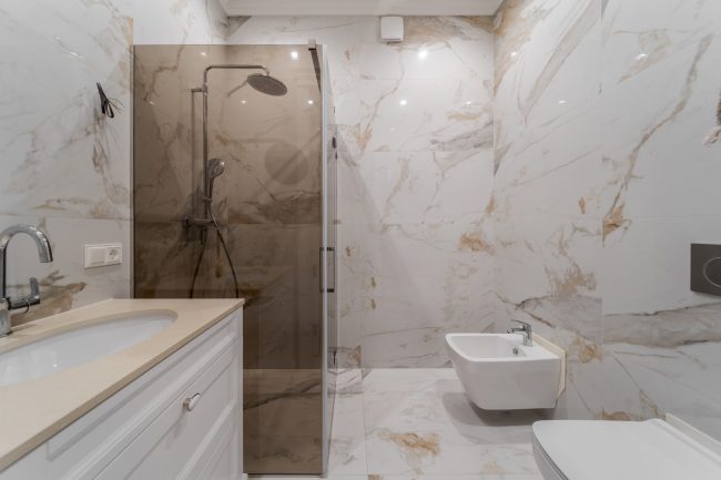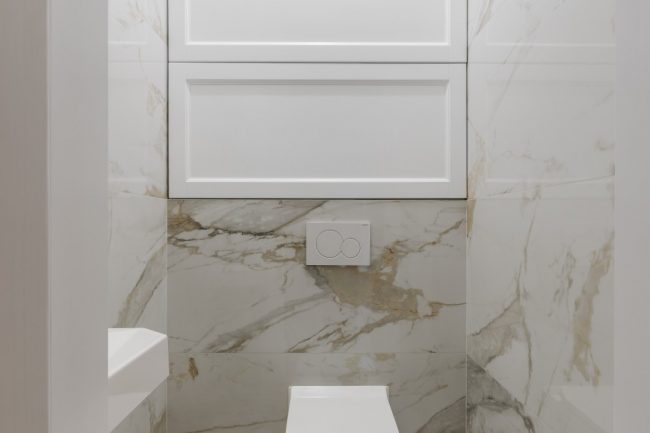 The highlight of the bathroom is the wall cladding made of natural marble tiles of solid size.