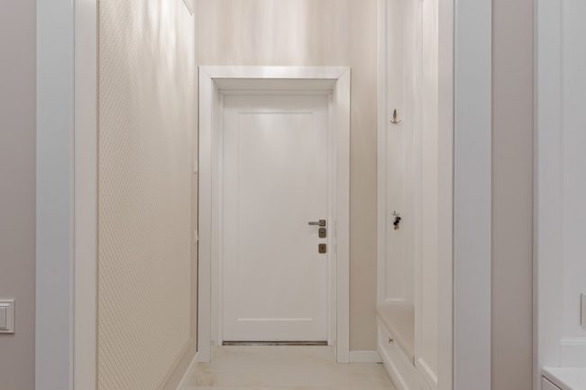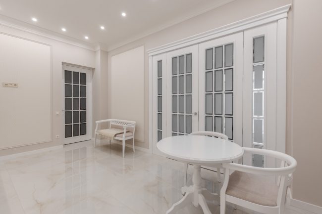 The floor in the hallway, kitchen, and bathroom is laid with expensive light tiles that, reflecting light with a shiny surface, visually expand the space. The hall appears much larger due to the reflection in a huge wall mirror.