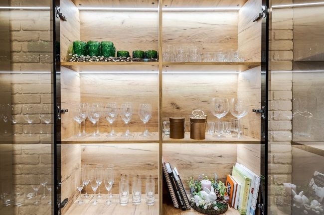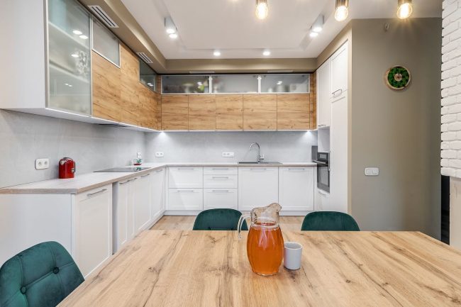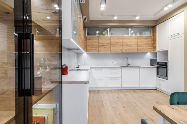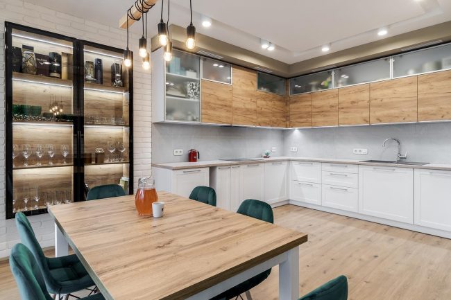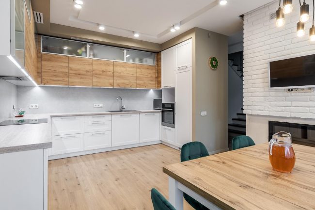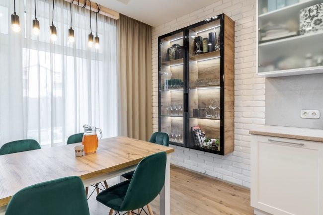 The wonderful texture and color of natural wood used for the countertops, fronts of hanging cabinets, and the floor bring a sense of cozy warmth to the overall atmosphere. The gray-white palette of the walls and ceiling is complemented by an accent of muted dark green upholstery on the backs and seats of the soft chairs. The finishing touches to the interior are the recessed lights installed around the perimeter of the rectangle and the glass panels of the fireplace and sideboard doors.