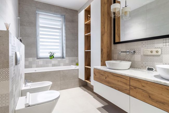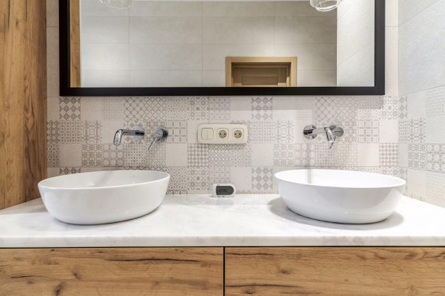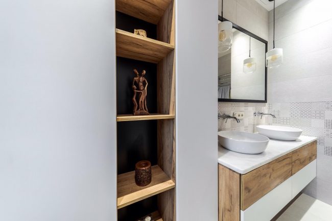 The restrained gray-white range in the design of the apartment is repeated in the decor of the bathroom walls, the geometric patterns of the ceramic tiles, the snowy white surfaces of the sanitary ware, the countertops under the sinks, and the original bowls of the sinks. Thanks to the solid internal volume of the wooden cabinet and wardrobe, it is easy to keep things tidy by storing personal hygiene and cleaning supplies inside.