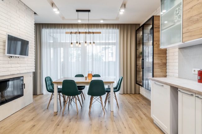 The design of the living room is done in light tones. The space of the large living room, combined with the kitchen, is filled with light through a large floor-to-ceiling window. The impression of solidity and stability is enhanced by simple walls made of whitewashed brick, with the same cladding on the monumental fireplace; moreover, the white color additionally increases the brightness, just like the white fronts of the kitchen cabinetry. Strict geometric shapes outline the silhouettes of the hanging sideboard, simple rectangular table, fireplace, and kitchen furniture, inspiring reliable confidence.