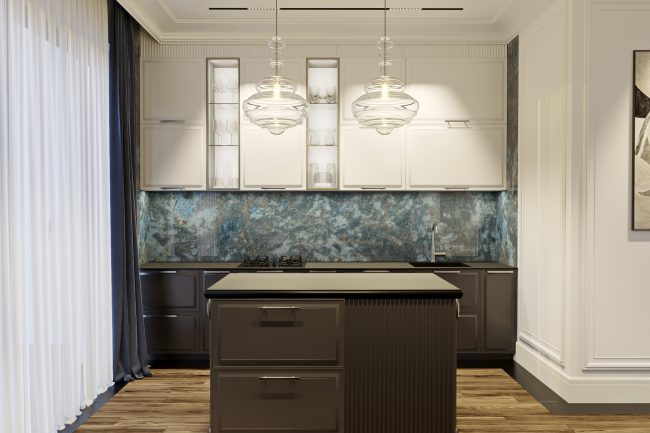 In the dining area, a large table for 6 people, a sideboard for serving, and a large plant add charm. The transition to the kitchen is made easy thanks to the cooking island with a wine fridge. The facades in white and graphite colors with neoclassical carvings add style and grace.