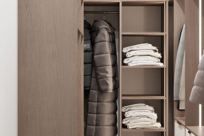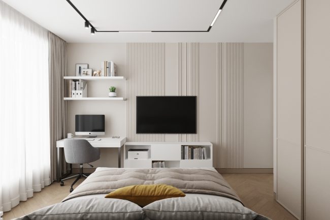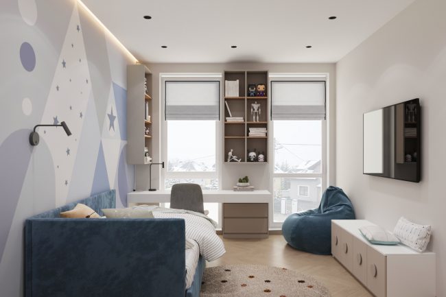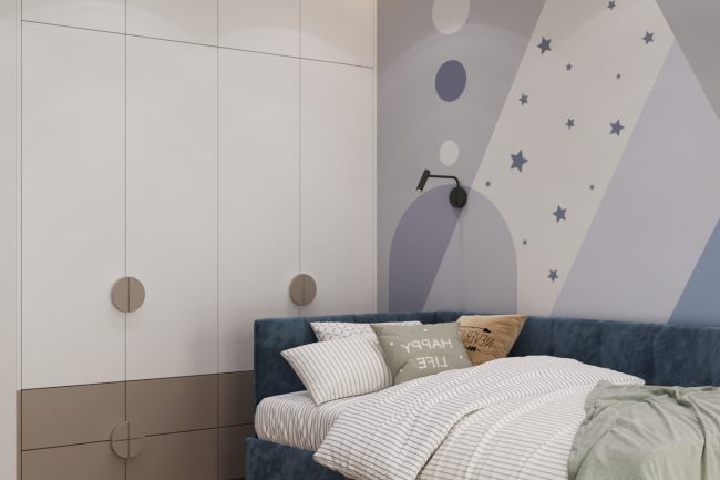 W sypialni właścicieli znajduje się duże szare miękkie łóżko, toaletka oraz lustro do sufitu, co dodaje przestrzeni i funkcjonalności. Pokój dziecięcy ozdobiony jest fototapetą z teksturą gwiazdek, ma komodę z telewizorem oraz dużą szafę na odzież i półki na zabawki, tworząc przestrzeń do kreatywności i zabawy.