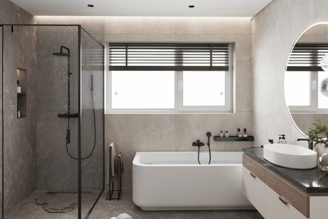 Łazienka została wykonana w odcieniach szarości, z użyciem płytek imitujących łupek i czarnej armatury. Wanna wolnostojąca i duże okno dodają przestrzeni jasności i przytulności. Strefa umywalki z czarnym blatem pod marmur i okrągłym lustrem z podświetleniem konturowym tworzy elegancki i nowoczesny wygląd.