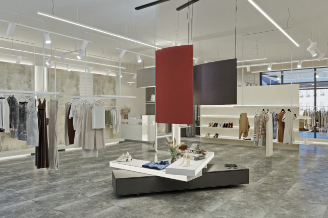 W centrum pomieszczenia znajduje się ekspozycyjna komoda, pokryta stylowym towarem. Półki wzdłuż ścian wyglądają jak dzieło sztuki, z powieszonymi ubraniami na tle szerokformatowych płytek z wstawkami z białych paneli skórzanych z perforacją. Każdy element staje się częścią wielkiej kompozycji, ujawniając estetykę markowej odzieży.
