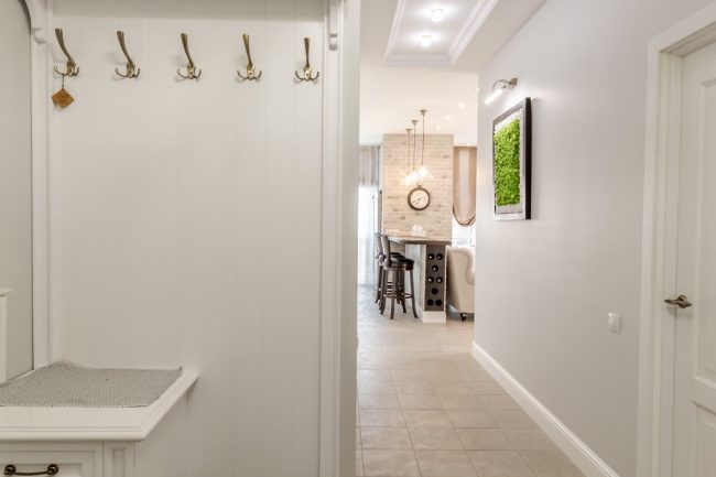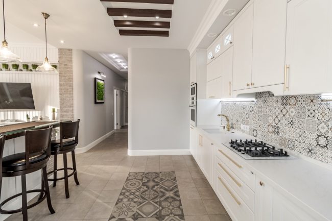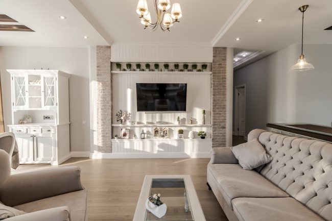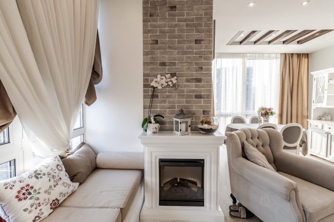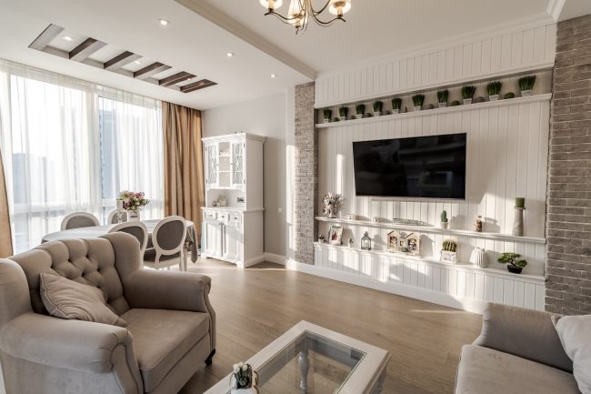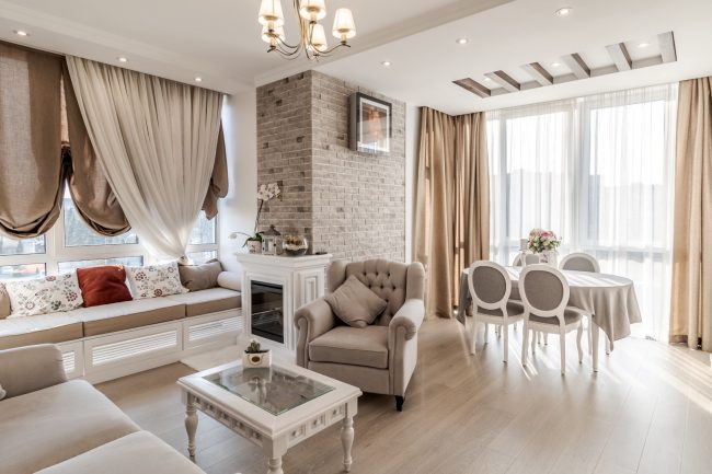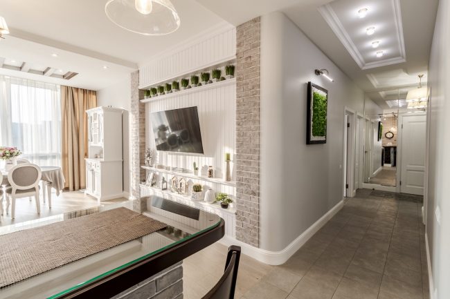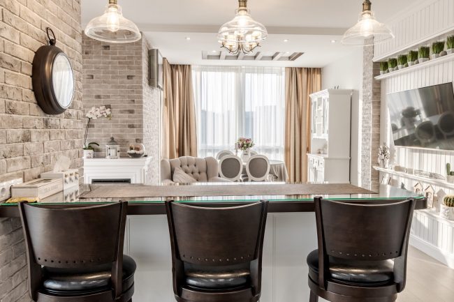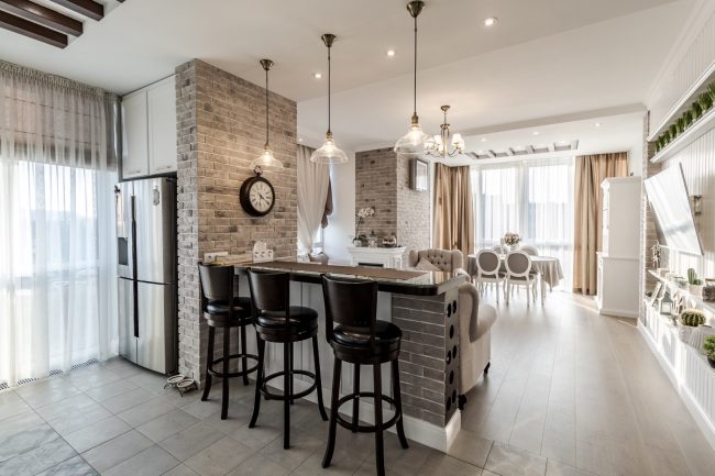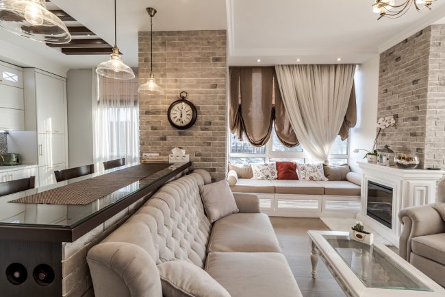 Ogromna przestrzeń, wypełniona ciepłem i przytulnością rodzinnego ogniska, dużo powietrza, jasne słoneczne światło, które przelewa się przez trzy duże okna — to pierwsze wrażenie od pomieszczenia, do którego prowadzi szeroki korytarz wyłożony kamienną płytką. Wyraźny podział na funkcjonalne strefy zaznaczony jest czworokątnymi pilastrami, obłożonymi szarymi kamiennymi płytkami w formacie cegły, co ciekawie podkreśla projekt mieszkania.