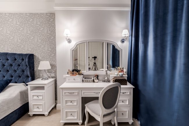 Nostalgicznym zapachem przytulnej dobrej starości przesiąknięty jest wystrój sypialni. Vintage’owy tryptyk, fronty szuflad w komodach, obszerna lampa, karnisze pod sufitem, mleczno-biała i pastelowa ogólna gama kolorów ścian, sufitu i mebli wspaniale uzupełnione są przez osobne przytłumione tony ciemnoniebieskich zasłon oraz aksamitnego zagłówka łóżka.