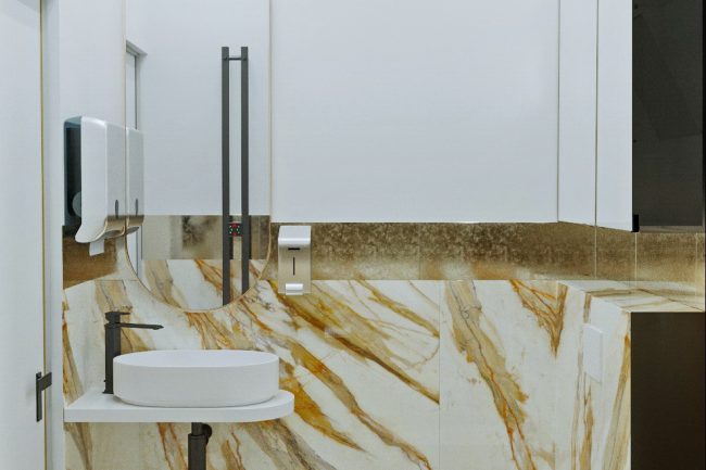 Wygodna i stylowa toaleta, w której każdy detal pomaga utrzymać czystość i komfort zarówno dla personelu, jak i pacjentów.