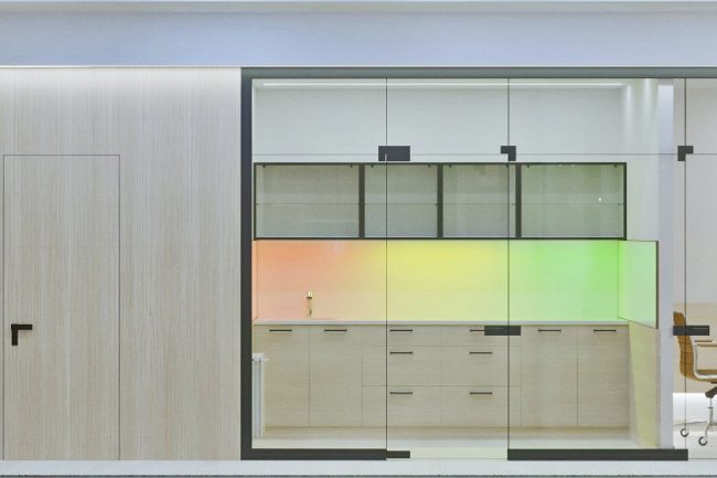 Strefa dla lekarzy do przebierania się i odpoczynku jest wykonana w stylu, który łączy przytulność i funkcjonalność. Drewniane listwy na suficie dodają naturalności i ciepła.