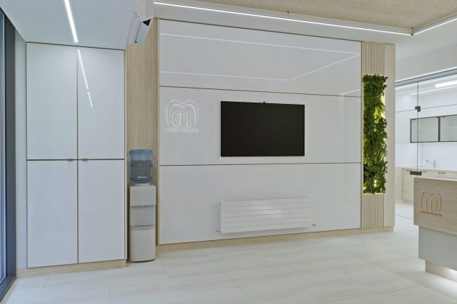 Przy wejściu pacjentów wita elegancka lada recepcyjna, wykonana w stylu nowoczesnego minimalizmu. Pomieszczenie jest utrzymane w jasnych tonach, z akcentami na naturalne materiały. Strefa oczekiwania jest wyposażona w wygodne meble i tworzy wrażenie przestronności dzięki szerokformatowym, połyskującym płytkom na ścianach.