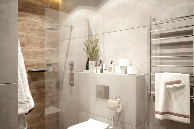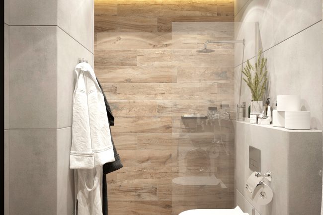 - Łazienka — wykonana w nowoczesnym stylu z użyciem płytek pod beton i czarnych akcesoriów, co odpowiada ogólnej koncepcji mieszkania.
