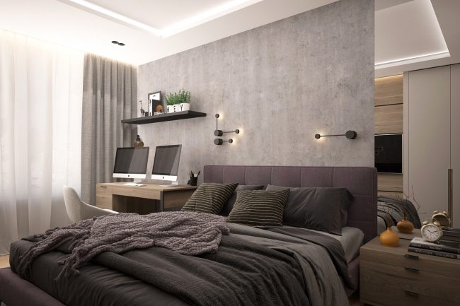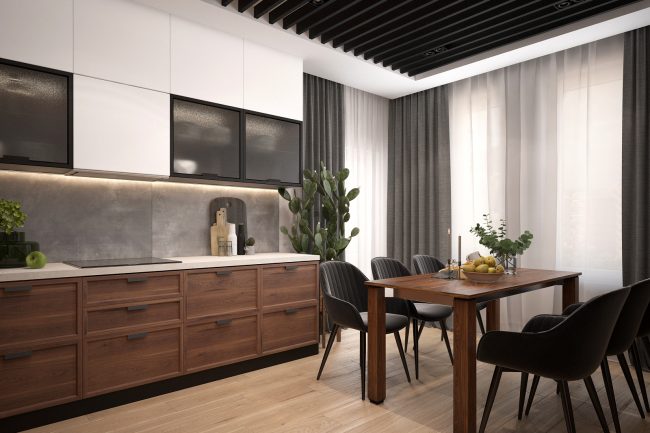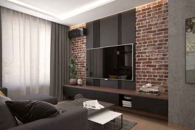 Główna koncepcja tego projektu polega na połączeniu otwartej przestrzeni z elementami designu industrialnego. W mieszkaniu dominują ciemne kolory i czarne matowe powierzchnie, które podkreślają styl loft. Przestronna kuchnia-z salonem jest głównym pomieszczeniem, które jest podzielone kolumną, wykończoną naturalną cegłą, co dodaje wnętrzu charakterystycznego akcentu loftowego.