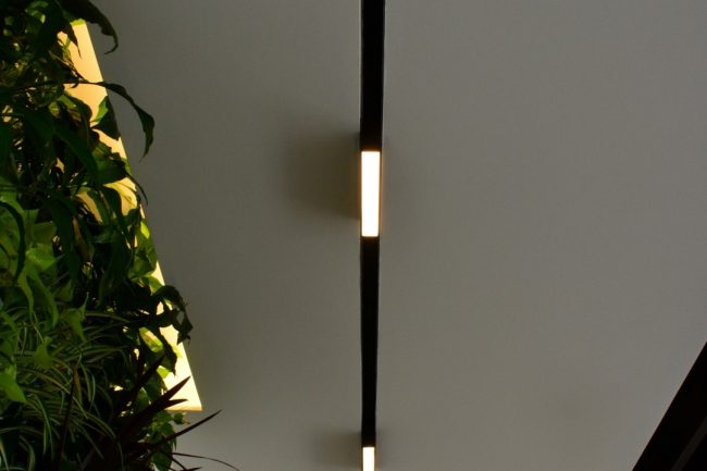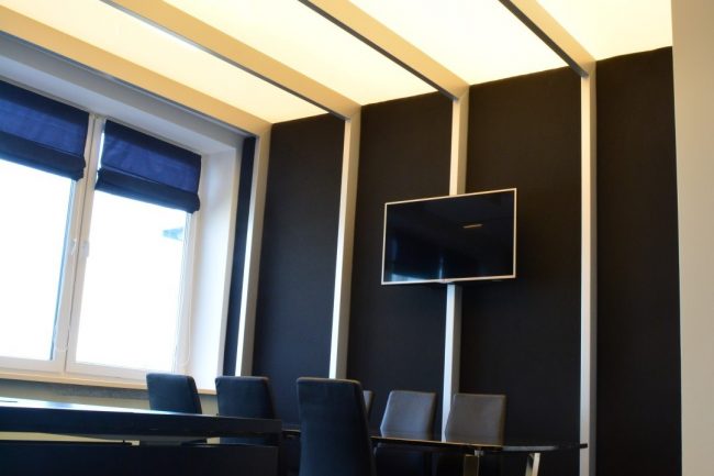 Miejsce na narady w projekcie wnętrza biura ma inny design. Imitacja belek, które podtrzymują sufit, kontynuuje się pionowymi listwami oraz ścianą. Pozostawiliśmy im przyjemny kolor naturalnego jasnego drewna, pokrywając je jedynie przezroczystym lakierem, dlatego te elementy dekoracyjne doskonale kontrastują z ciemno-brązowym odcieniem ściany. Jedna z „belek” pełni praktyczną rolę — zamontowano na niej duży monitor.