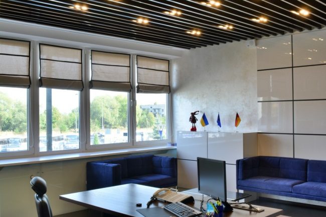 W recepcji na ścianie znajduje się kolejne panel, jednak z błyszczących paneli w beżowym odcieniu. Nad jasnym kolorem ścian i podłóg — ciemny, praktycznie czarny sufit, podzielony liniami belek. Pomiędzy nimi w grupach rozmieszczone są lampy. Rzymskie zasłony dobrano tutaj w mlecznym odcieniu. Kilka sof z niebieską tapicerką ulokowano przy ścianach.