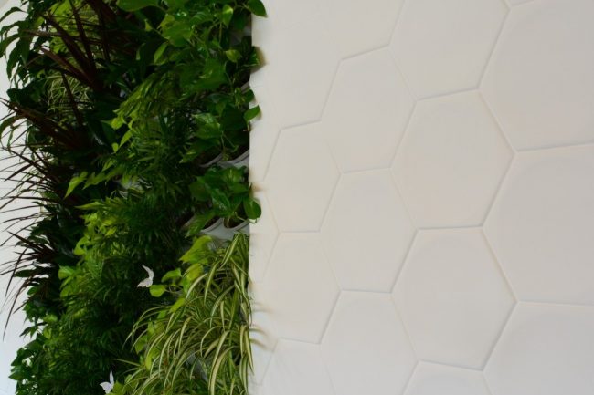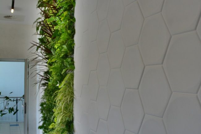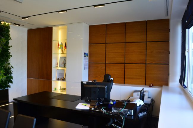 Sufit i ściany wykonane są w białym kolorze. Duża drewniana płyta w kolorze jasnego drewna, podzielona liniami na kwadraty, zajmuje widoczne miejsce na ścianie za plecami dyrektora. Po prawej stronie znajduje się szafa na 4 sekcje do dokumentów, z otwartą przegrodą na nagrody. Po obu stronach znajduje się pionowy stojak-ściana z żywymi roślinami.