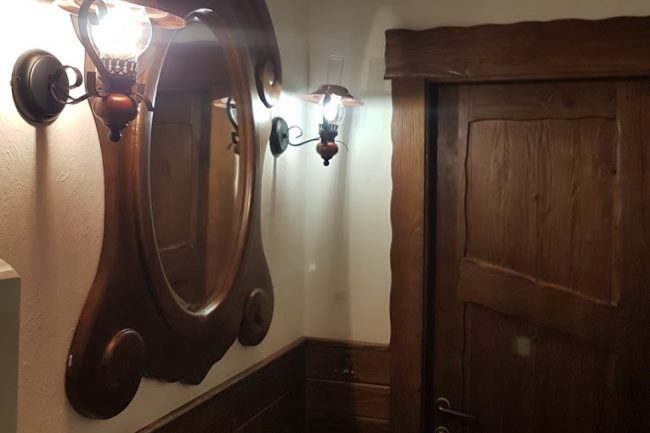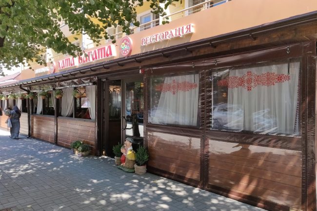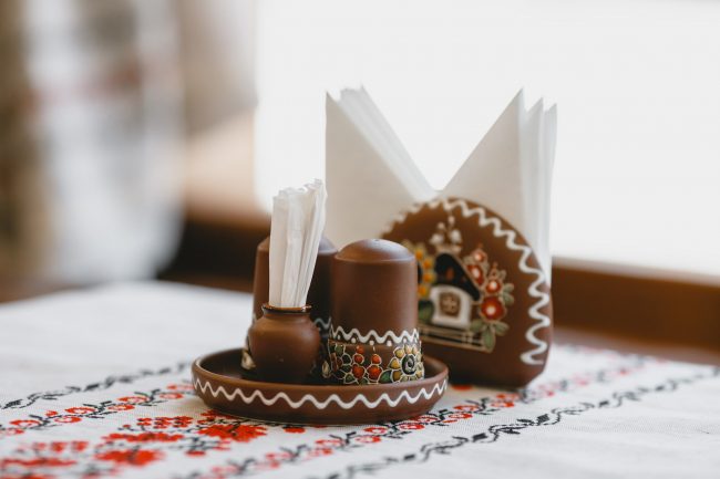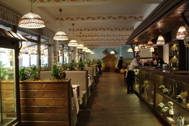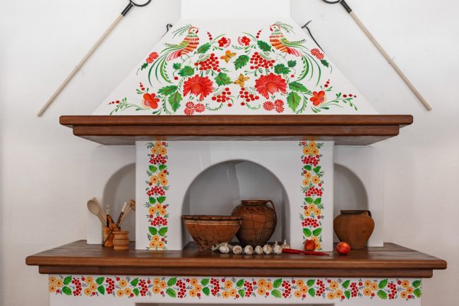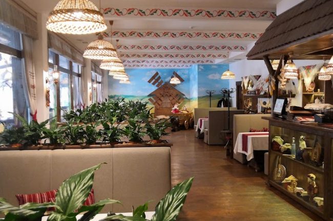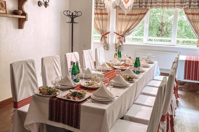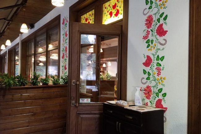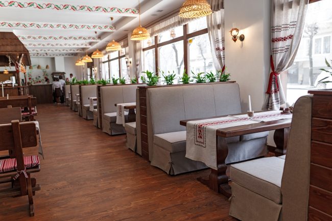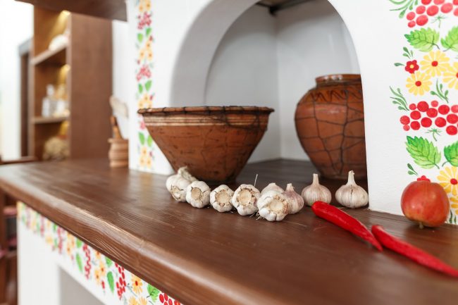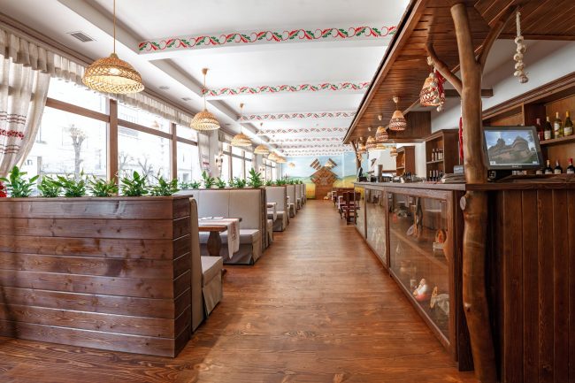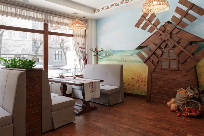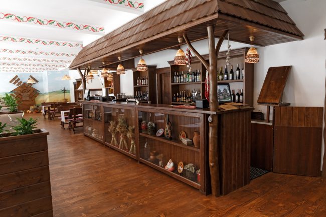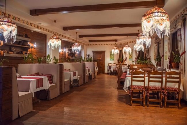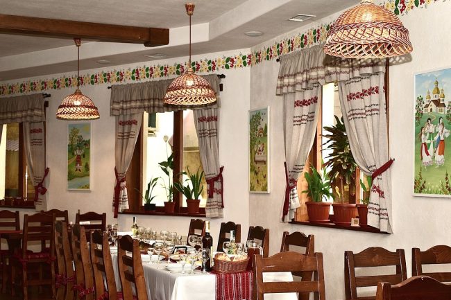 Po obu stronach tradycyjnego pieca w projekcie wnętrza restauracji znajduje się regał stylizowany na kredens z glinianymi talerzami. Drewniana ławka dla wygody została unowocześniona i ozdobiona poduszkami z pokrowcami z ukraińskim haftem. Projektant nie zapomniał również o skrzyni na odzież, która niegdyś była w każdym domu, huculskich kożuchach i krisani. Na ścianie nad piecem znajdują się tradycyjne haki do wyjmowania gorących garnków z gotową potrawą.