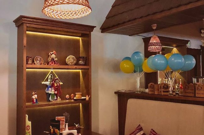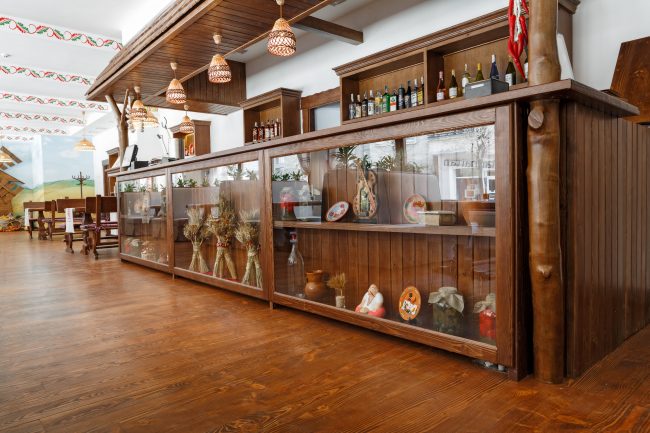 Lada barowa w projekcie wnętrza restauracji została wykonana z naturalnego lakierowanego drewna, przykryta daszkiem, a jej front, zwrócony w stronę klientów, zajmuje szklana witryna, w której znajdują się tradycyjne przedmioty codziennego użytku, dziady.