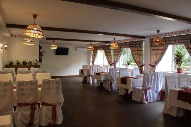 Opracowanie projektu wnętrza dla projektu wnętrza restauracji Chata Bogata obejmowało aranżację kilku sal, w tym wybór tekstyliów. Ogólnie rzecz biorąc, cechuje je wspólna stylistyczna jedność, wspólność elementów dekoracyjnych i atrybutów. Różnice polegają na podziale przestrzeni i doborze różnych opcji mebli. W głównej sali postanowiliśmy oddzielić stoliki drewnianymi ściankami do wysokości oparć sof, a w sali bankietowej przy stołach stoją krzesła w prostych białych pokrowcach z haftowanymi wstążkami.