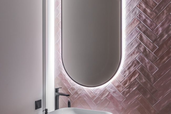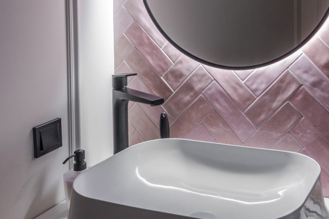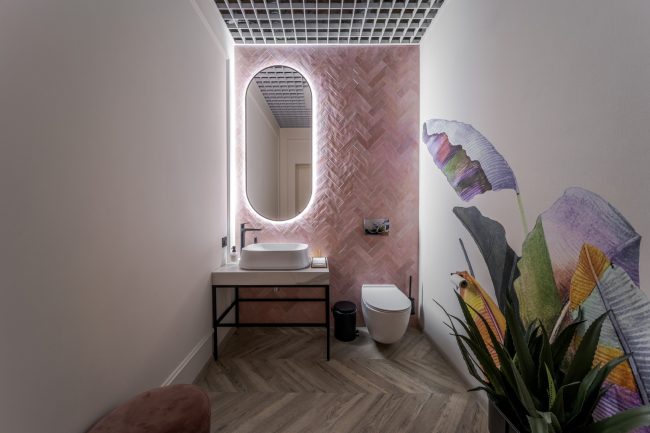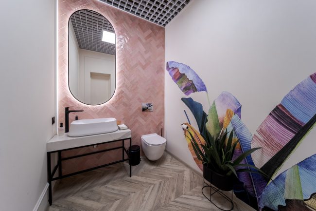Дизайн санвузла відповідає загальній концепції. Санвузол витриманий в білих та рожевих тонах, накладна раковина незвичайної форми стоїть на тумбі в стилі лофт. На стіні тут повторюється той же малюнок фантазійних листків пальми в пастельних тонах, що й у манікюрному залі.