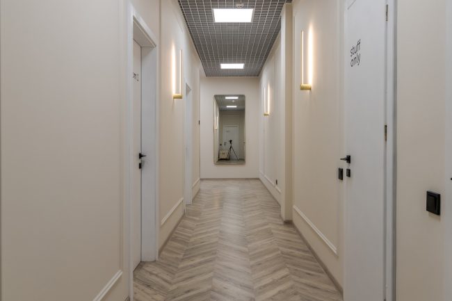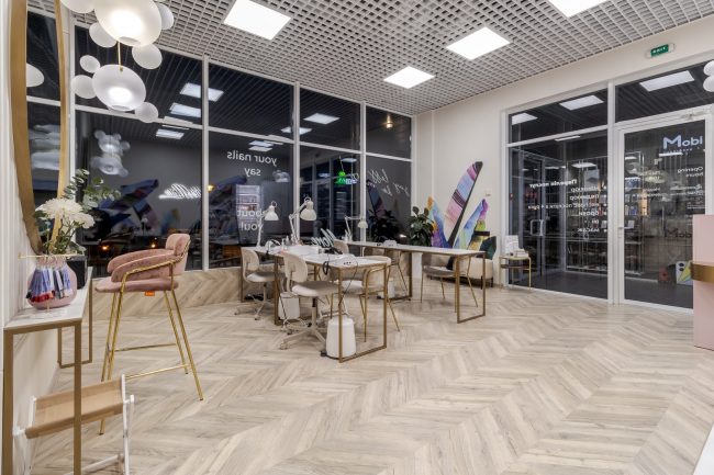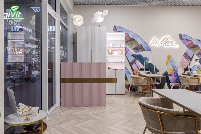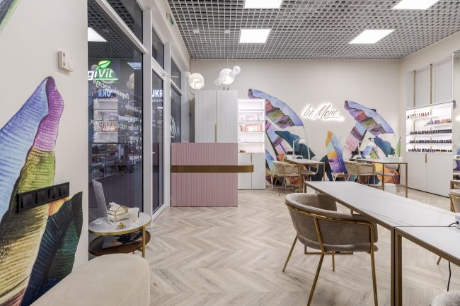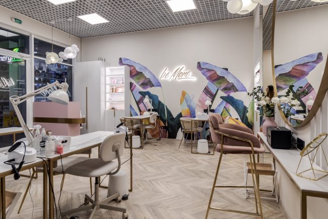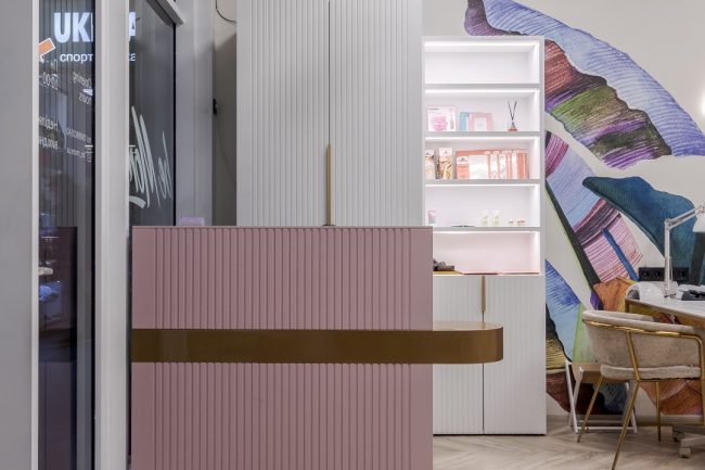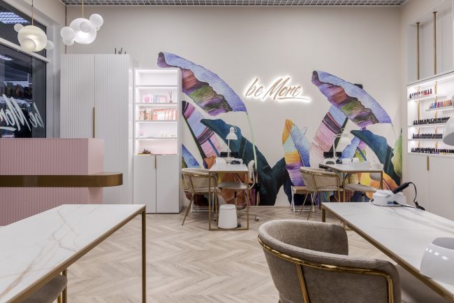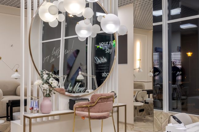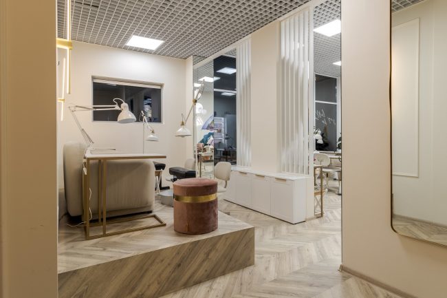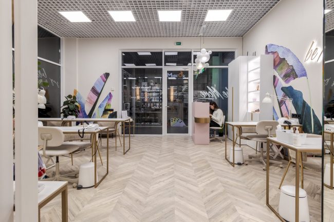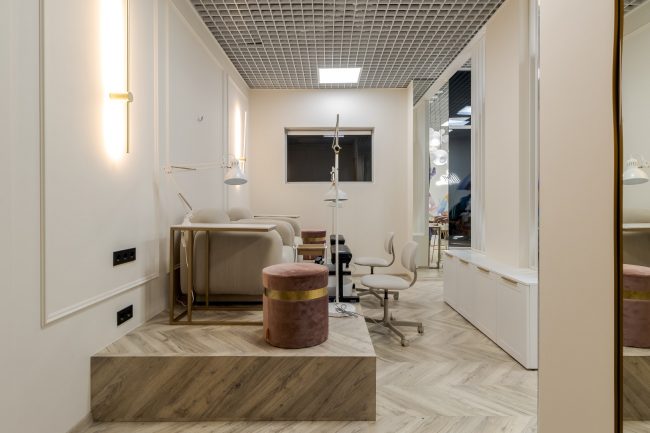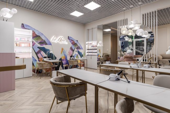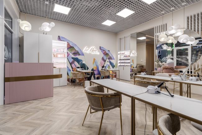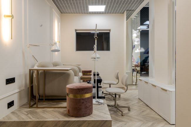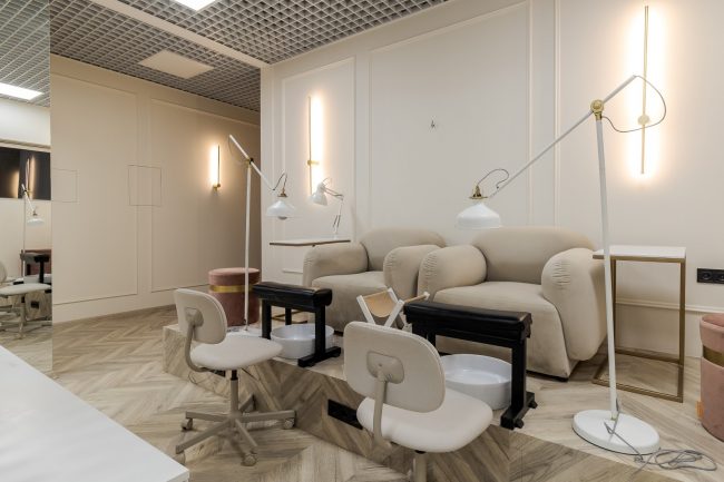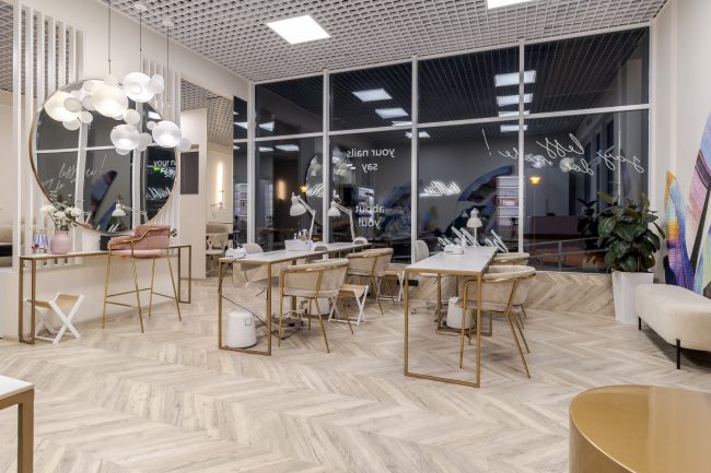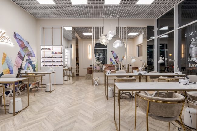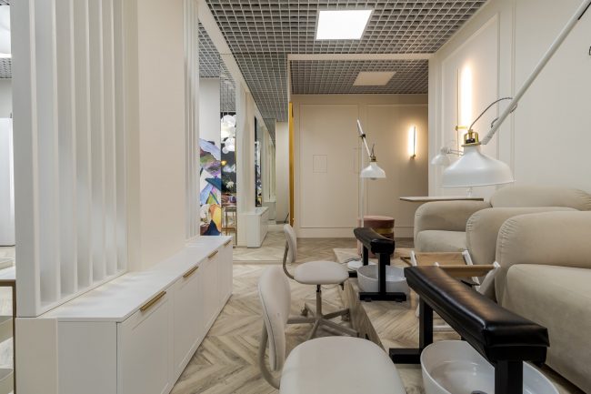 Великий манікюрний зал оформлений в єдиному стилі — всі столики та крісла належать до однієї колекції. Зона для педікюру відділена білою перегородкою, якою слугує стелаж для витратних матеріалів, та композиція з вертикальних планок, що нагадують колони. Остання виконує роль основи для величезного круглого дзеркала в золотистій рамі.