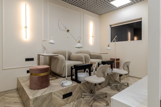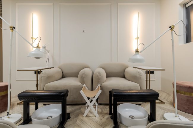 Крісла для клієнток в зоні педикюру ми вирішили розташувати на подіумі. Для відвідувачів підібрали два масивних та неймовірно затишних м’яких крісла з оббивкою відтінку слонової кістки. Біля них розташувалися два вузенькі пуфи-підставки для ніжок, оздоблені чорною глянцевою шкірою, столики для майстрів та лампи.