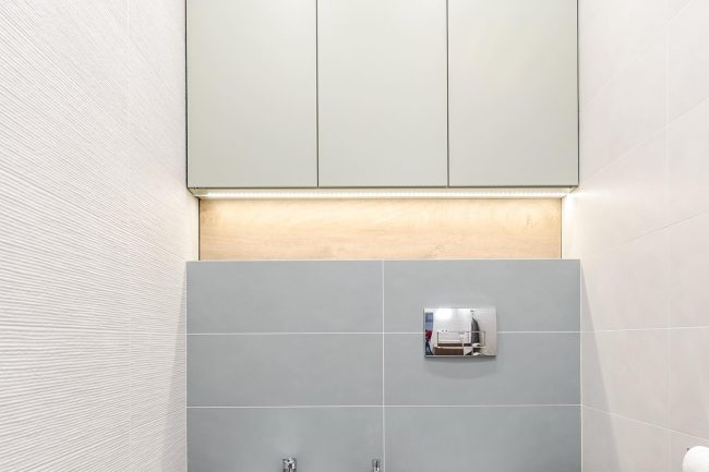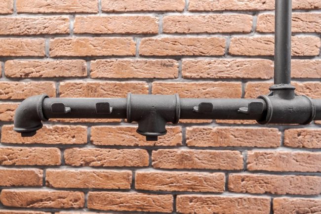 В інтер’єрі вдало використане поєднання базових натуральних матеріалів. Цегляна стіна справа в коридорі доповнена притаманним індустріальному стилю елементом у вигляді вінтажних чавунних труб, протилежна стіна декорована штукатуркою під бетон, сучасні лінійні світильники сховані між дерев’яними рейками під стелею. Насичений колір теракоти вносить нотку свіжості в композицію сірого відтінку бетону, білосніжних стін, стелі та в загальний дизайн квартири.