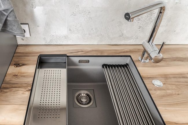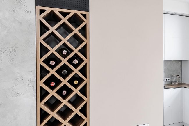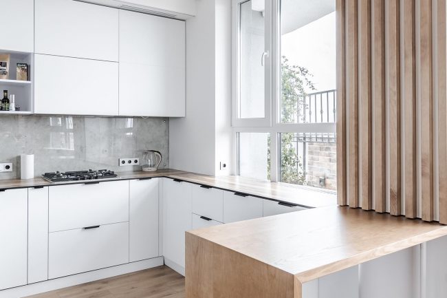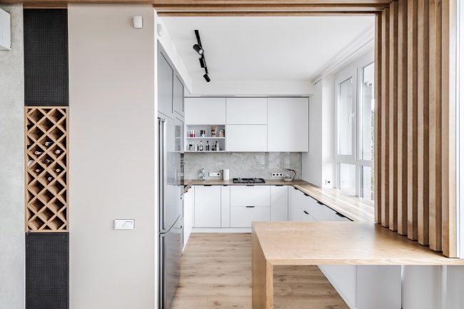 Лінія розмежування кухонного приміщення та коридору позначена продовженням паралельних рейок з натурального дерева на стелі та стіні, та завершується дерев’яною барною стійкою-столом. Загальне враження атмосферності та свіжості підсилюється яскравим денним освітленням завдяки великим вікнам та виходу на широку лоджію.