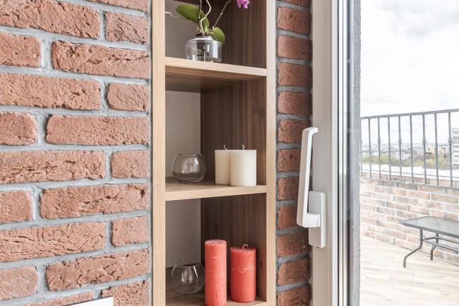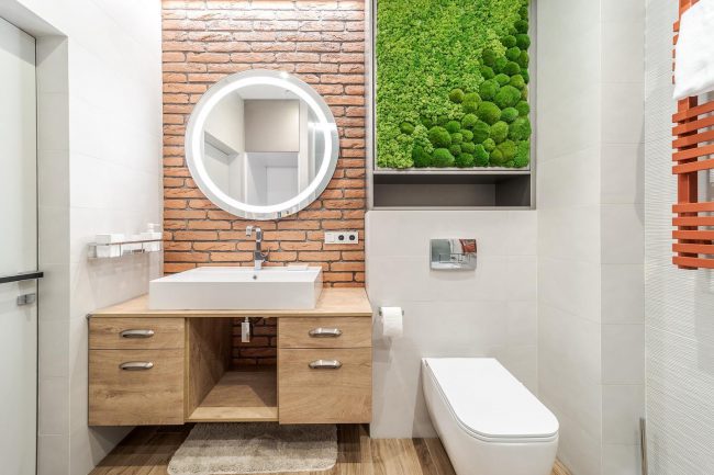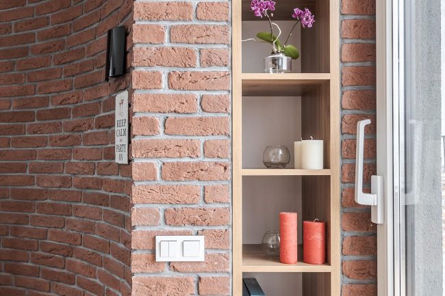 Зона відпочинку нестандартної півкруглої конфігурації облицьована ретельно викладеною цеглою. Її обладнано вбудованим відкритим дерев’яним стелажем, полиці якого заповнені милими дрібничками.