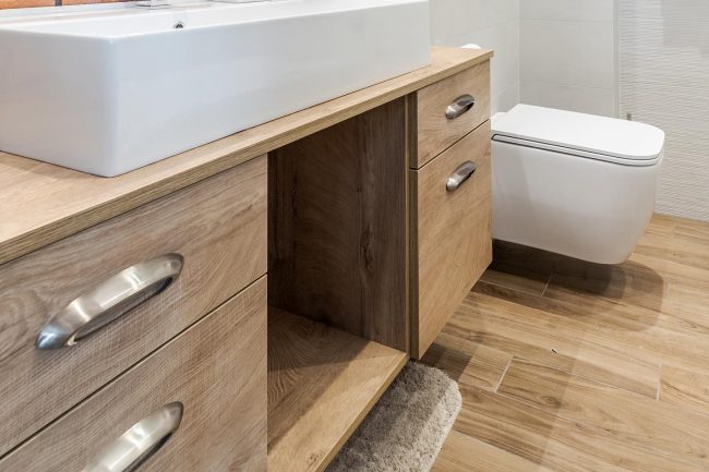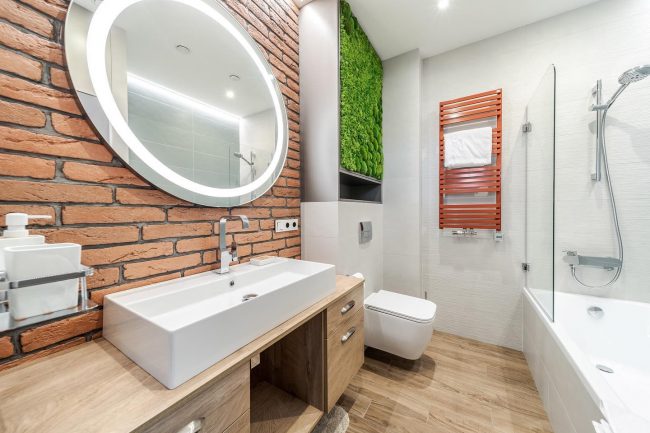 В дизайні просторого санвузла використано традиційне поєднання кольорів білосніжних ванни, унітаза, біде, сірих стінних панелей, дерев’яної тумби під великою керамогранітною раковиною прямокутної форми та цегляної стіни.