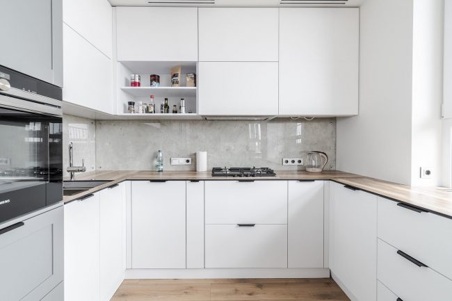 Дизайн кухні функціональний. Кухонний гарнітур оснащений сучасною технікою, фасади сяють первісною чистотою. Його елегантна простота підкреслюється стільницею з імітацією світлого натурального дерева, дворівневою стелею з вмонтованими лінійними світильниками.