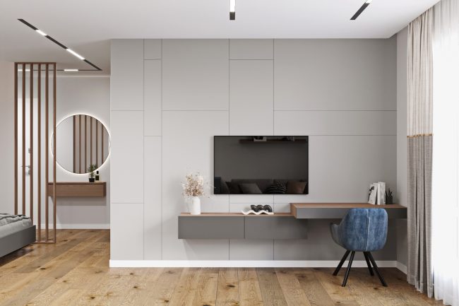 Телевізор, встановлений на стіні з декоративними панелями, стає центральним елементом розваг та інформації. Під ним знаходиться стильний комод, який органічно переходить у робочий стіл. Ця зона ідеально підходить для роботи чи вивчення. Велика кількість природного світла та ретельно продумане розташування меблів допомагають зберігати відчуття простору та свіжості у всьому приміщенні.