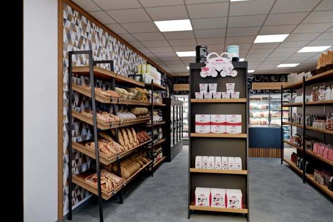 Багато дерева присутнє в інтер’єрі, що балансує жорсткість металу та бетону. Дерев’яні полиці, стійки та декоративні елементи додають тепла й природності, створюючи затишок у магазині та забезпечуючи гармонію між індустріальними і природними матеріалами.