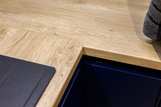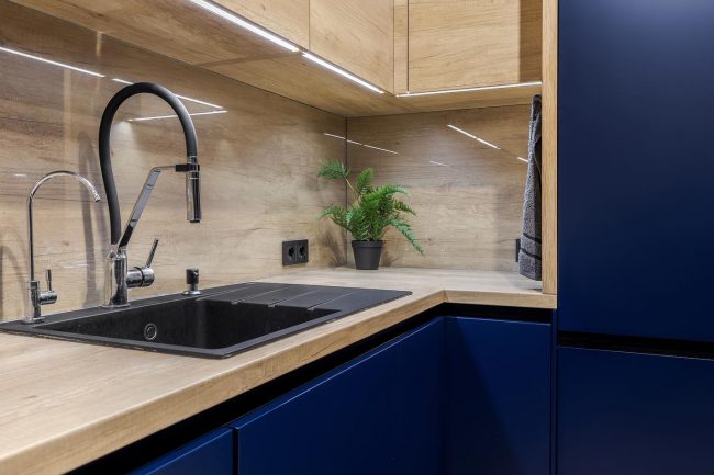Погляд не відволікається на зайві деталі, яких тут немає, натомість милується чергуванням класичного сполучення темно-синього з золотистим відтінком масиву дорогої деревини стільниці, дверцят навісних шафок, стінного фартуха, дощок підлоги.