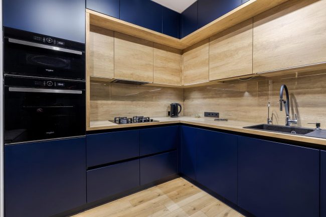 Дизайну кухні вигідно підкреслює світле натуральне дерево заглибленої середньої частини гарнітура, текстура якого ще виразніше проявляється лінійною підсвіткою, обрамлене темно-синіми матовими фасадами нижніх тумбочок, вертикальними площинами справа та зліва і антресольними шафками вгорі під стелею. Симетрично до розміщеного справа високого вмістимого двокамерного холодильника зліва встановлено духовку та мікрохвильову піч.