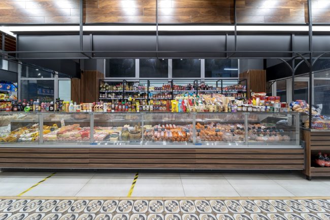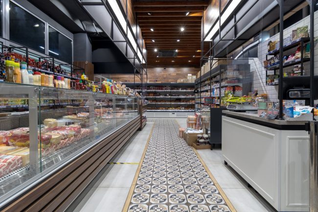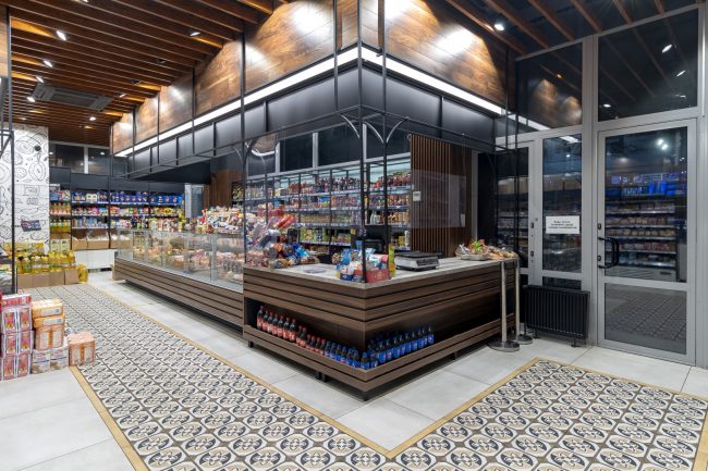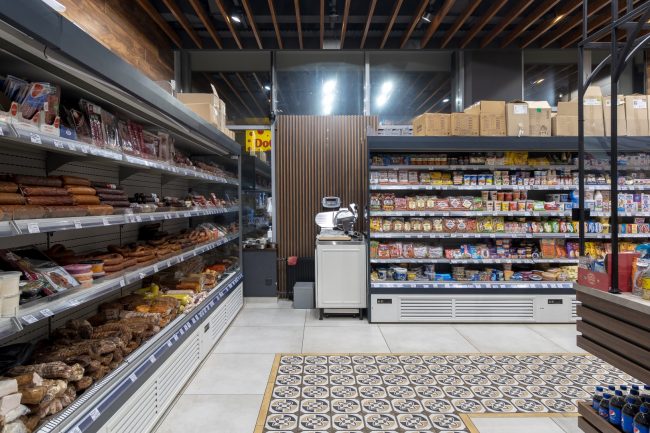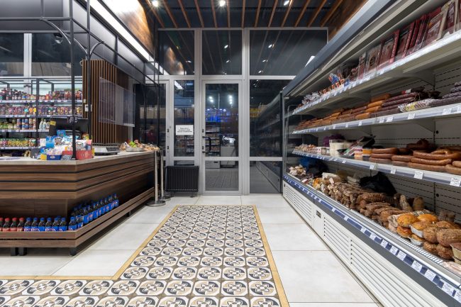 Місце для електронної ваги, де покупці можуть зважити вибрані продукти, виділено за допомогою дерев’яної панелі, що нагадує розташовану біля каси, однак тут лінії стали вертикальними.