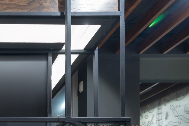 Дизайн стелажів для продуктів — типовий притаманний стилю лофт. Стелажі виконано з металевих рейок, надійно зварених та пофарбованих в чорний колір.
