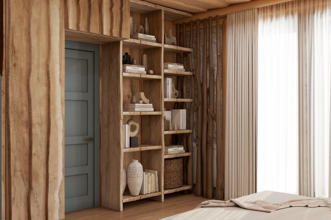 Дизайн спальні та кабінету у стилі соснового зрубу створює атмосферу затишку та гармонії з природою. Використання натуральних матеріалів, таких як деревина, штукатурка мазанка та глиняні глеки, робить інтер’єр теплим та екологічним. Плетені килими з народними мотивами та каміни типу буржуйка додають інтер’єру унікальності та підкреслюють стиль зрубу.