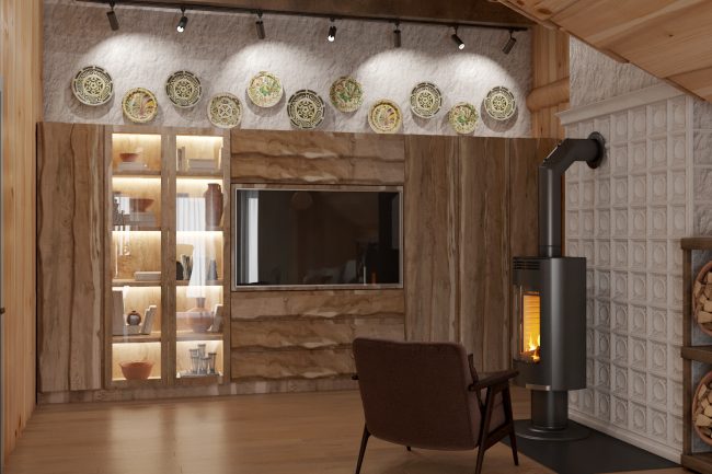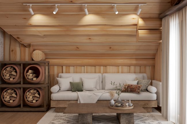 Цей дизайн проект інтер’єру виконаний у стилі соснового зрубу, який поєднує природні матеріали та затишну атмосферу. Основна увага приділяється використанню дерева у всіх елементах інтер’єру, що надає приміщенням тепла та гармонії з природою.
