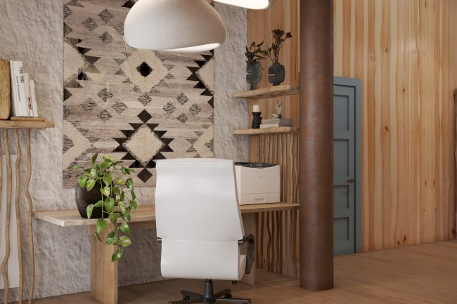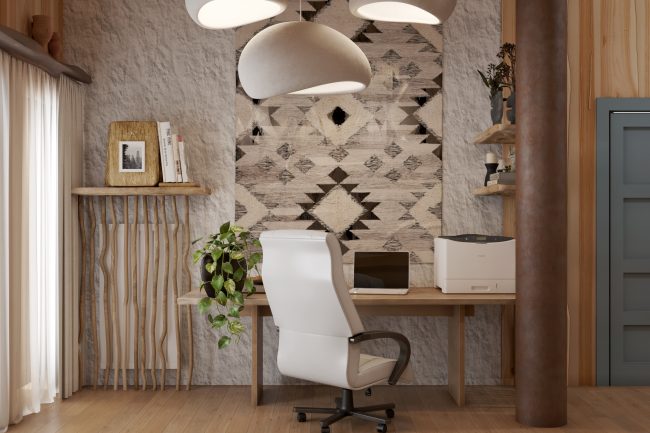 На стінах кабінету розміщені плетені килими з народними мотивами, які додають приміщенню етнічного колориту та підкреслюють традиційний стиль. Також у кабінеті розміщена велика шафа, що забезпечує зберігання книг, документів та інших речей, необхідних для роботи.