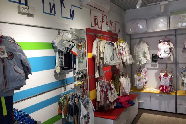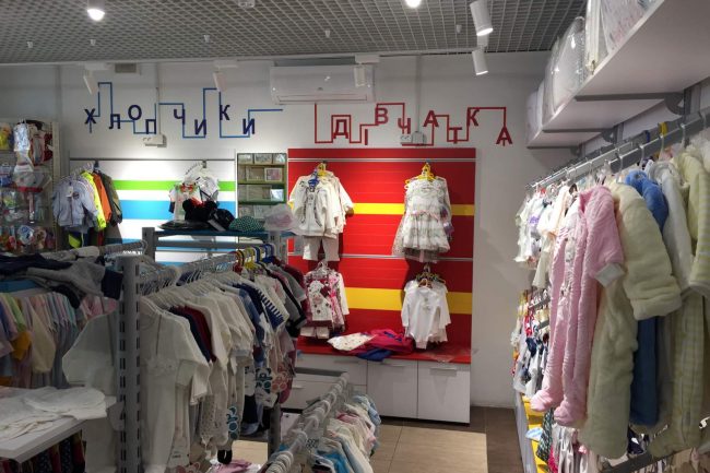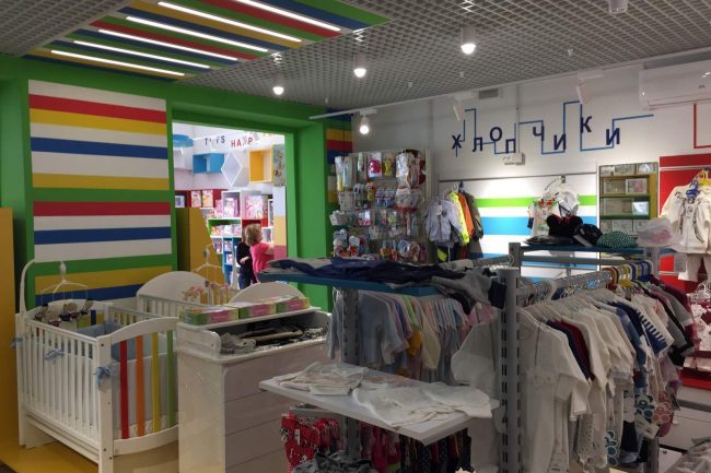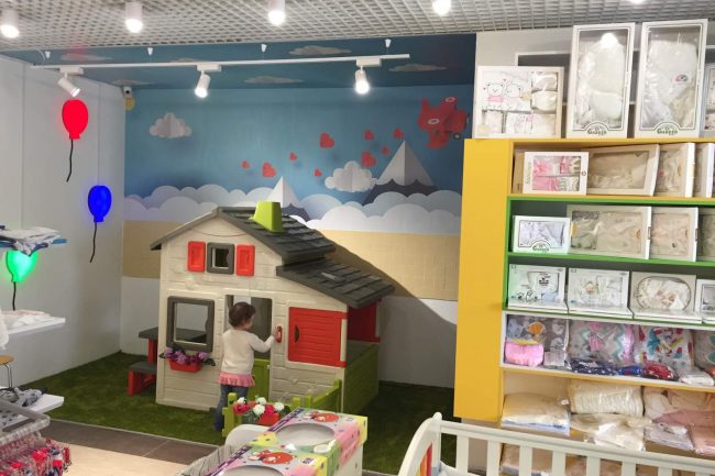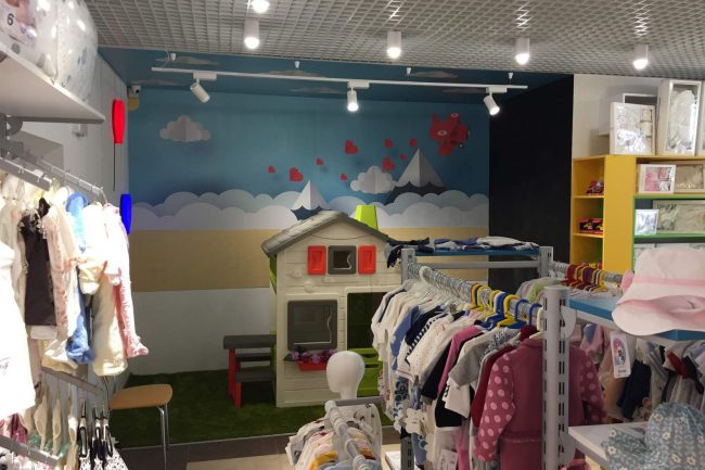 Передбачена спеціальна зона для ігор малюків. Тут біла стеля, закрита декоративною решіткою, простір добре освітлений, на підлозі — килим зі штучної трави. Знайшлося місце не лише для стелажів та полиць, стійок з дитячим одягом, іграшками, а навіть для ігрового будиночка. Поки батьки вибирають речі для дітей, малюки можуть відпочити та розважитись.