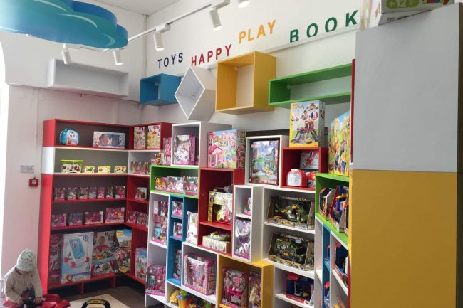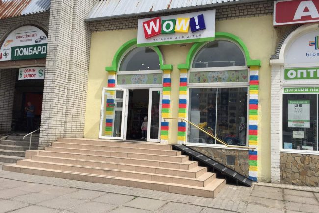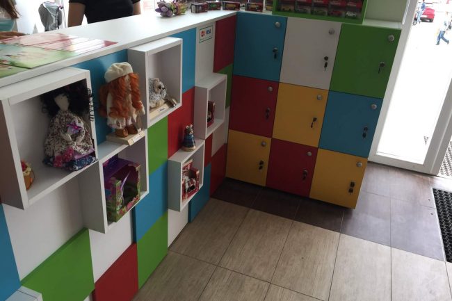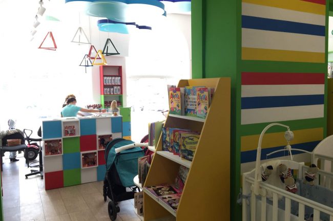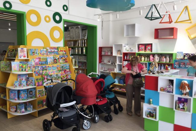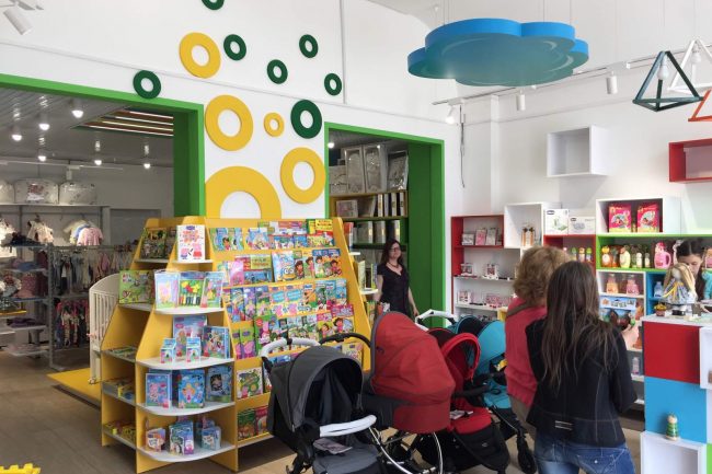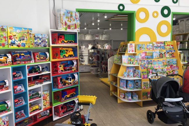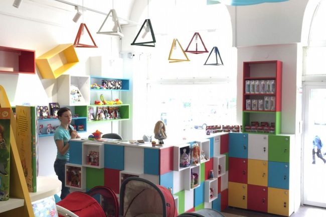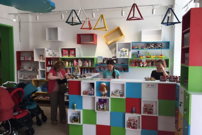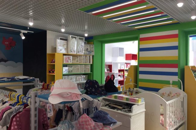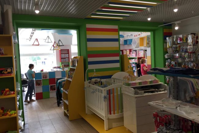 Дизайн інтер’єру магазину для дітей гармонійний у всіх деталях та ретельно пропрацьований — від входу до найдальших куточків приміщення. Кольорова гама складається з веселих життєрадісних відтінків — трав’янисто-зеленого, жовтого, червоного, блакитного та білого. Чергування кольорів повторюється і в оздоблення входу надворі, і на стійці адміністратора, і на стендах та стелажах. Яскраві квадратики, прямокутники привертають увагу дітей та їх батьків, створюють позитивний настрій, налаштовують на веселощі та додають приємних вражень.