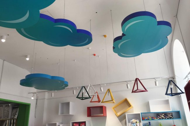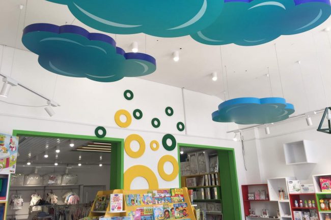 Для книжок, альбомів та інших товарів сконструйовано яскраві стелажі різної форми — прямокутні, трикутні. Під стелею висять веселі блакитні хмаринки. Освітлення здійснюється за допомогою довгих ламп денного світла та точкових світильників.