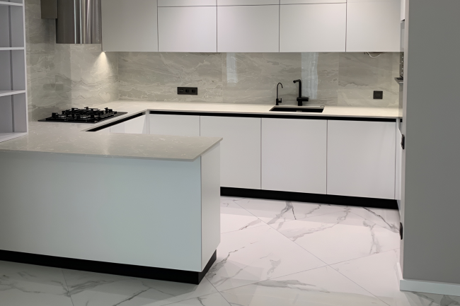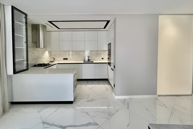 The placement of the kitchen zone is strictly defined, dictated by the necessity of connecting communications. The exterior minimalism of the kitchen’s design hides maximum convenience for the user behind its laconic facades. Access to the spacious interior is achieved with a light press on the doors, thanks to high-quality hardware. The technological equipment includes, among other things, a two-chamber refrigerator, a microwave, an electric oven, a gas stove, a futuristic-looking hood above it, a drinking water filter, and an electric kettle. Above the island counter is a glass display cabinet with lighting.