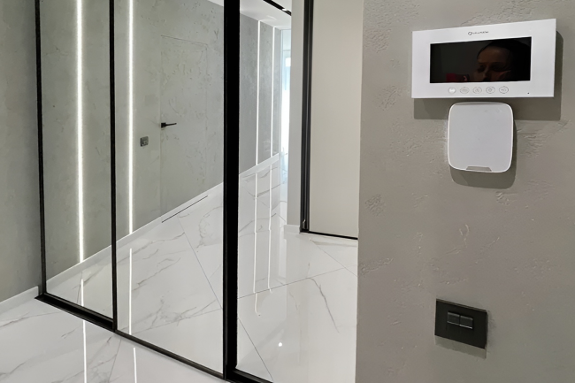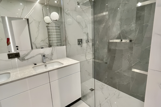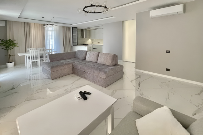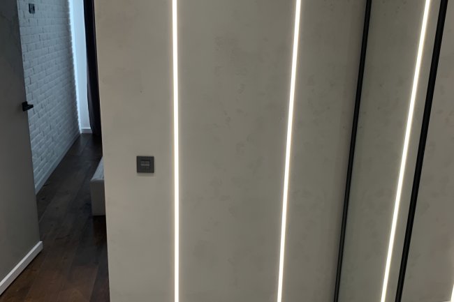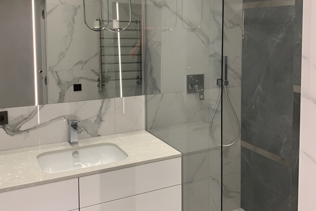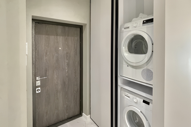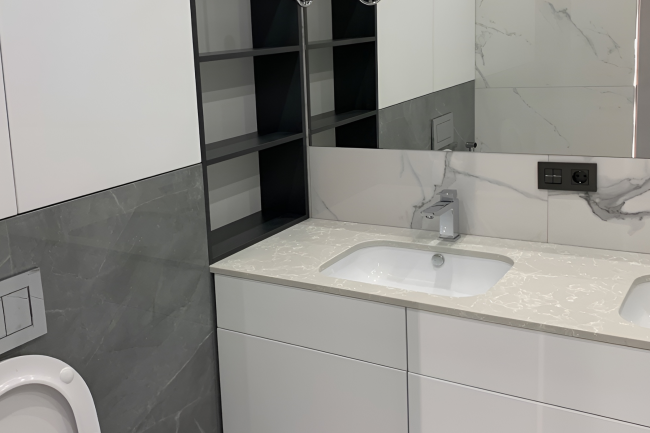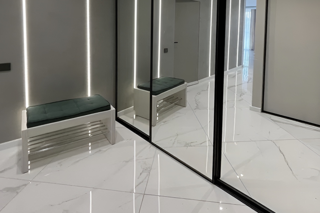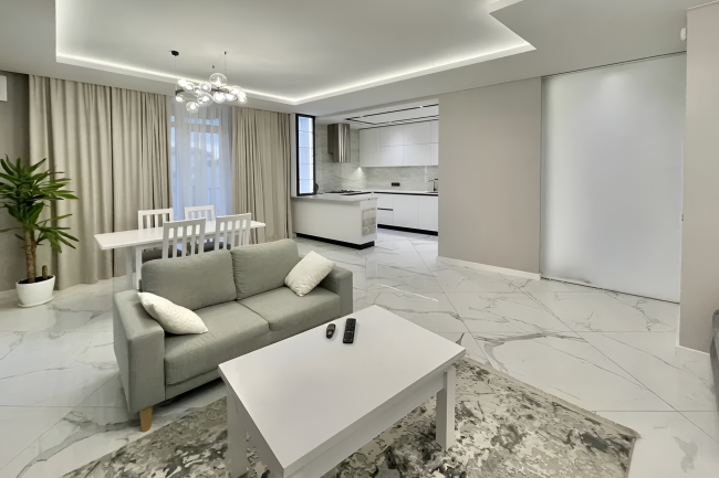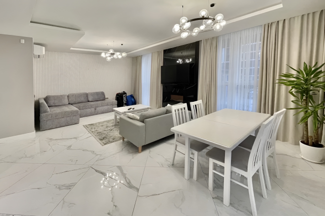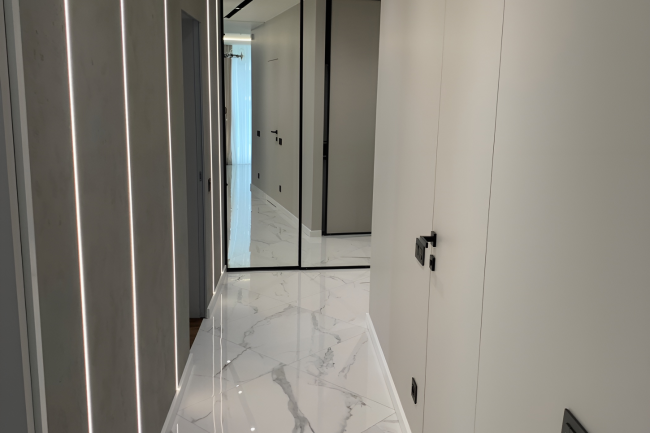 A rectangular dining table with chairs marks the dining area in the interior design. The relaxation zone is symbolized by two sofas, a coffee table, and a large TV panel. Comfort is maintained by heat curtains in the floor before the exit to the balcony. The color scheme in neutral light gray and beige tones is enhanced by large-format ceramic tiles on the floor, extending into the technologically advanced bathroom and hallway, where, opposite the washing and drying machines, there is a built-in wall mirror closet with three sliding doors. A similar spacious wardrobe is installed in the roomy, cozy bedroom. Interior design of such an apartment should be entrusted only to professionals — we have the experience to handle projects of this class!
