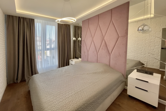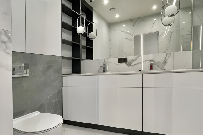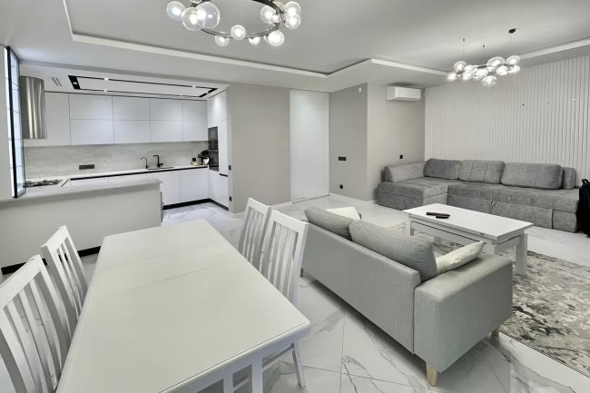 In the interior design of the apartment, the trendy approach of combining the kitchen, dining room, and living room into one large space without unnecessary partitions has been implemented. This solution fully corresponds to the modern-day philosophy, which proclaims the removal of restrictions on freedom. The absence of boundaries defining a set place for each functional zone embodies the concept of mobility and care for the tenant’s practical needs regarding furniture arrangement.
