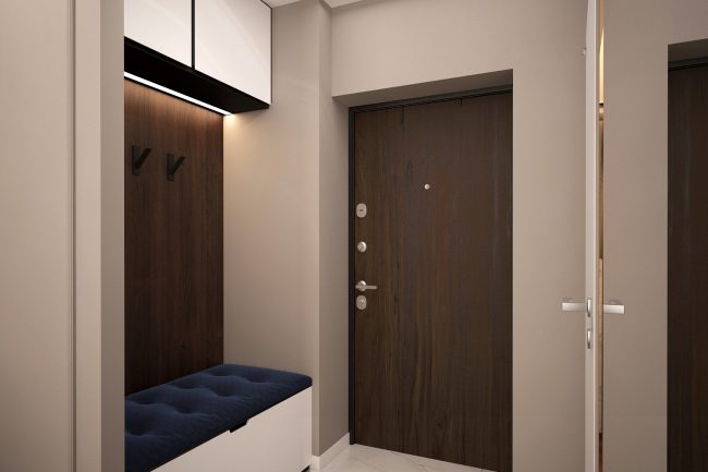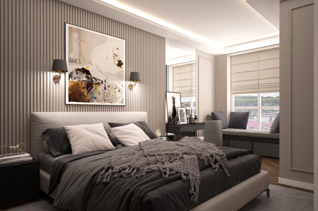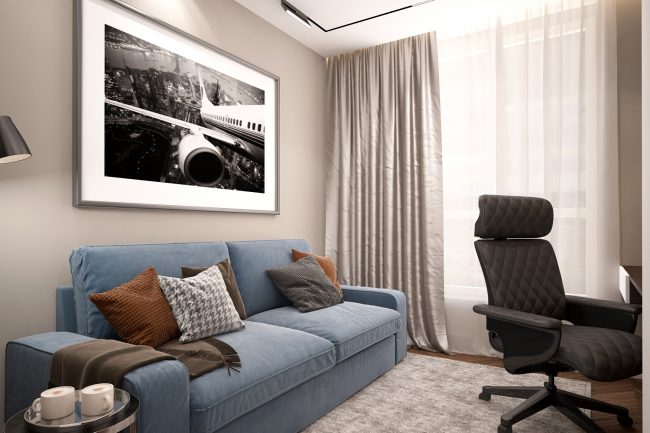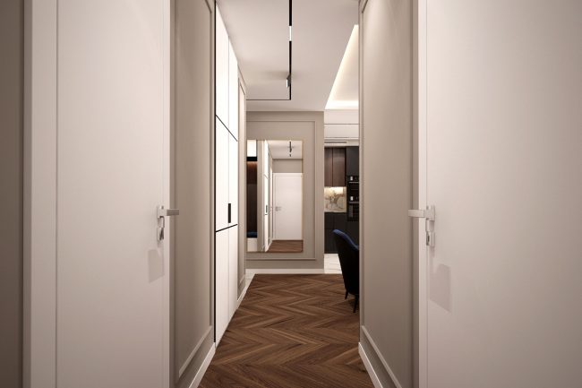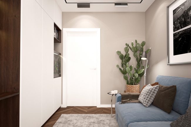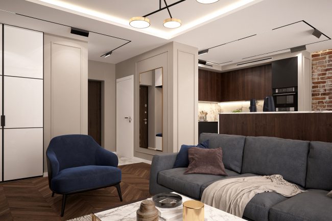 Salon to serce każdego mieszkania, a ta koncepcja projektu zakłada stworzenie atmosferycznej przestrzeni z dużą szarością sofy i ciemnoniebieskim fotelem. Ta aranżacja dodaje stylistykę neoklasycyzmu poprzez zastosowanie sztukaterii na ścianach i białego koloru drzwi.